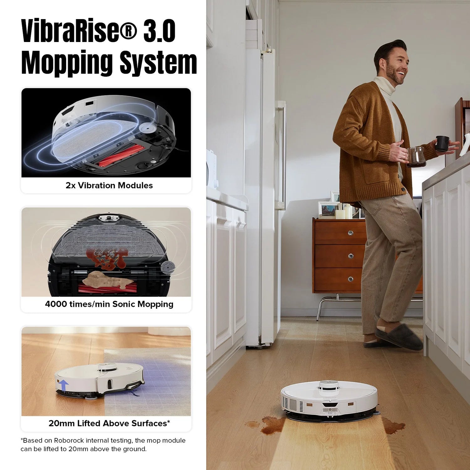 Opremljen z močnim sesanjem do 10.000 Pa , S8 MaxV Ultra učinkovito odstranjuje prah, umazanijo in živalsko dlako. Zvočni sistem za brisanje VibraRise® čisti tla z veliko hitrostjo in samodejno dvigne krpo, ko zazna preproge, s čimer prepreči prenos vlage.